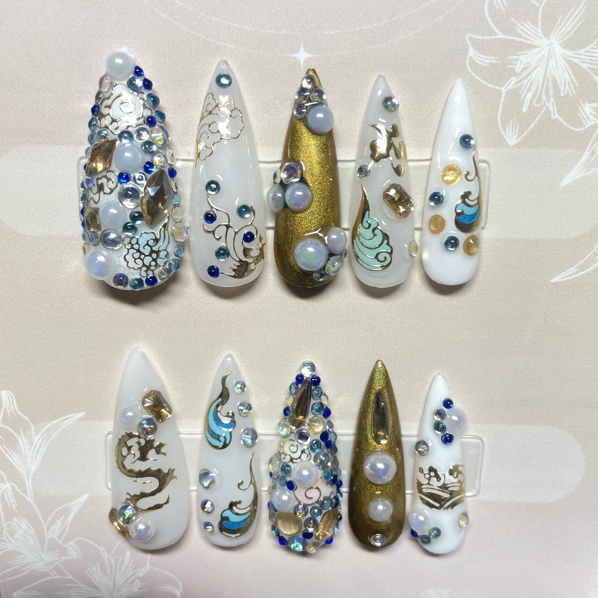 The Golden Dragon Nail Set is an intricately designed set of nails, featuring charms and rhinestones. The pearly white and gold color range adds a touch of elegance, while the dragon designs tie it all together. Elevate your nail game with this stunning set.