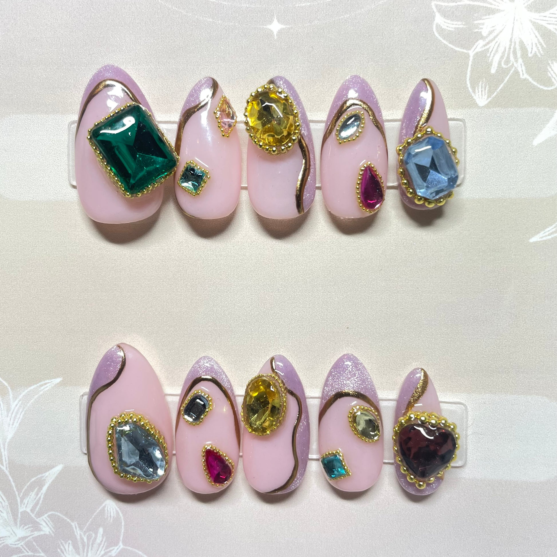 This set of nails features a light pink base with cat eye polish and gold chrome accents. Adorned with large rhinestones, this set adds a touch of elegance and sparkle to your nails. Perfect for any special occasion or just to add a touch of glamour to your everyday look.