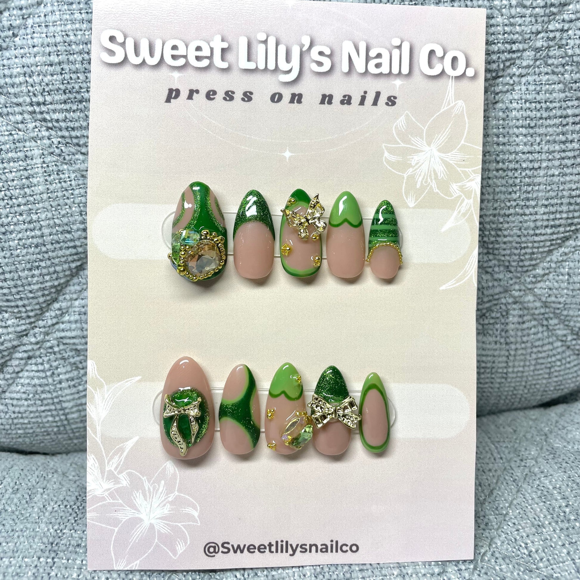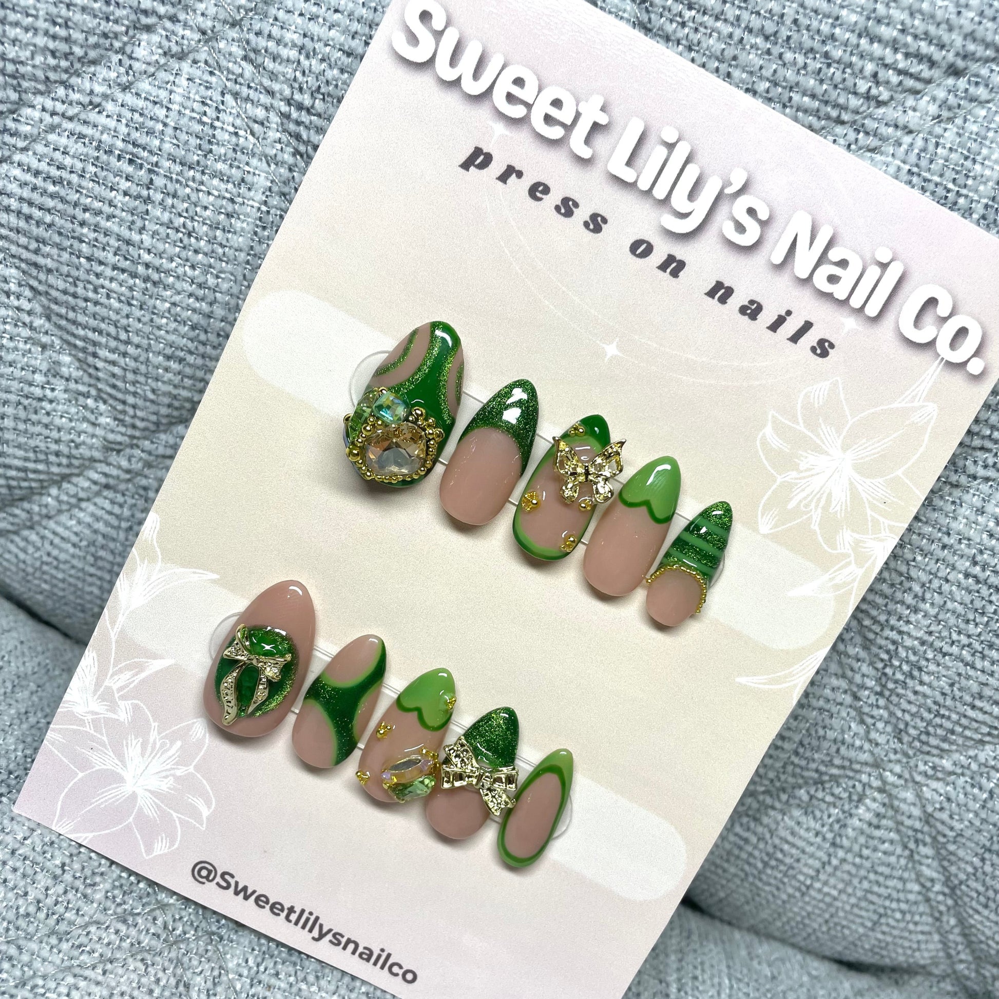 This Lucky Pot of Gold Set features an elegant green design with cat eye details and gold charms, paired with colorful rhinestones. Perfect for adding a touch of good luck and elegance to any outfit. Each hand crafted set many vary in charms depending on inventory.
