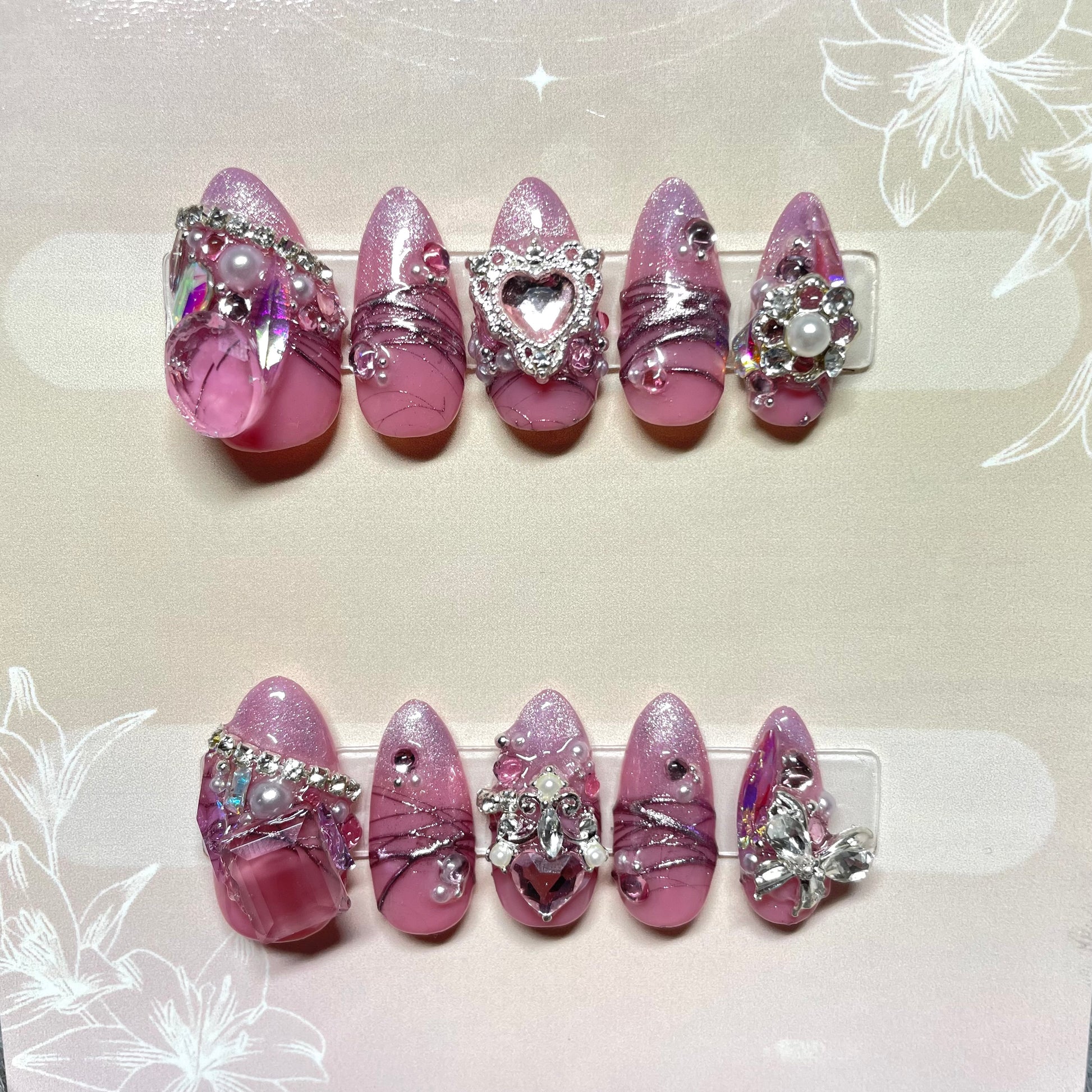 This Pink Treasure Chest Set is elegantly painted with a cat eye ombre design and embellished with rose gold chrome accents, silver and pearly charms, and sparkling pink rhinestones. Enhance your style with this eye-catching accessory. Each hand crafted set may vary in design depending on what charms we have in stock.