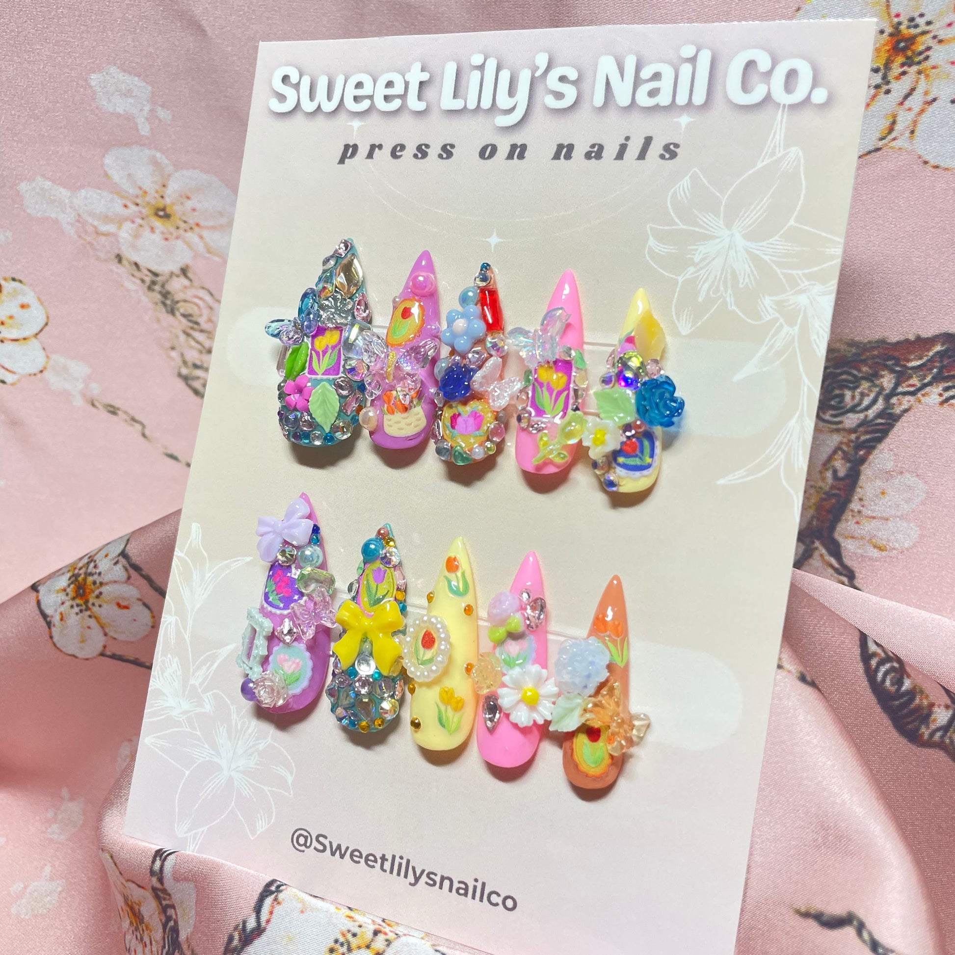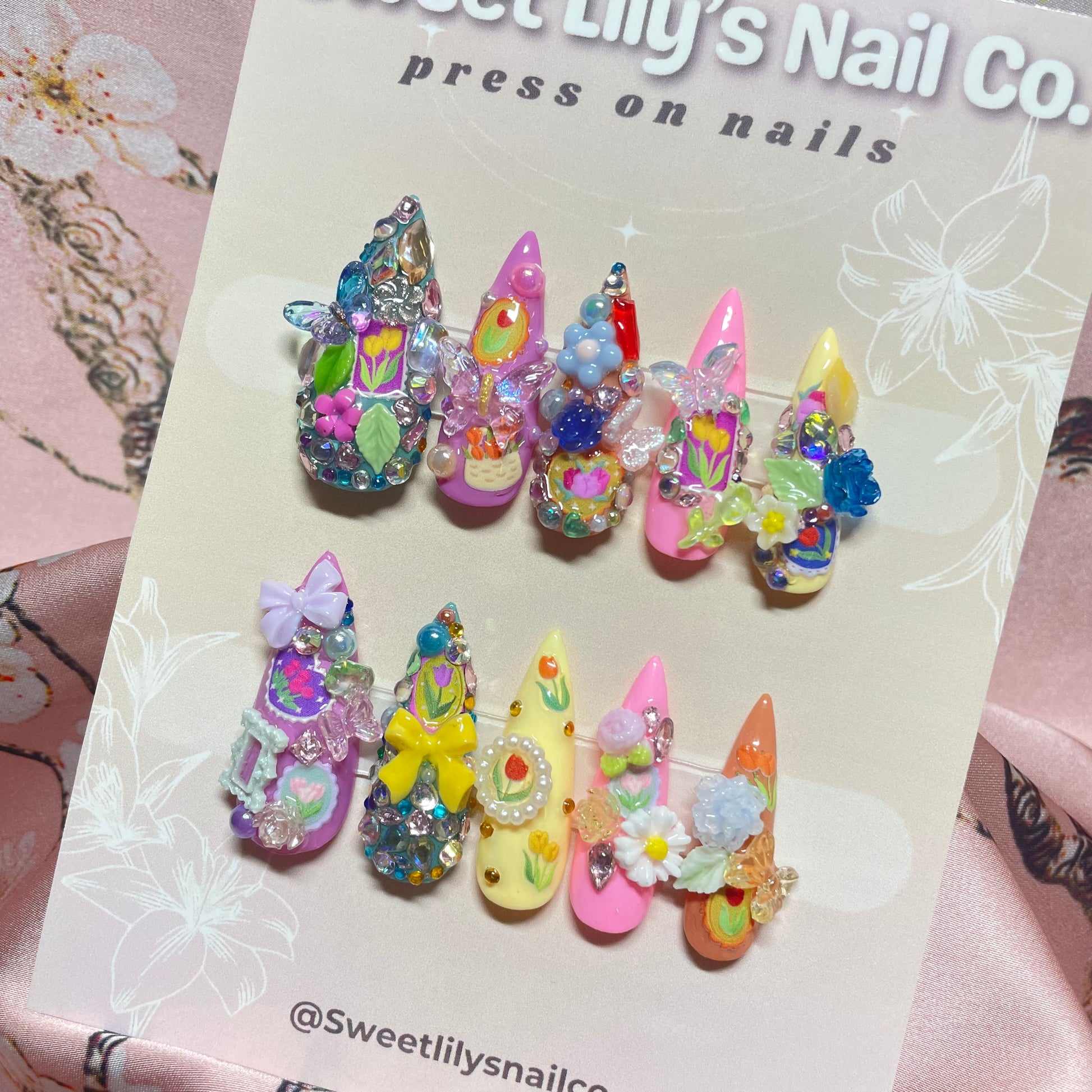Introducing the Fairytale Garden Set, a hand-crafted set of press on nails inspired by enchanted gardens. Each set is unique and features the same intricate design as seen here. Experience the magic of fairytales with these one-of-a-kind nails.