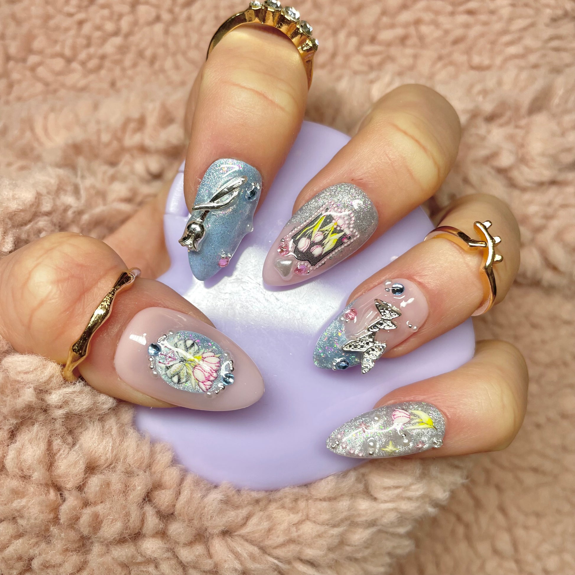 Relive your childhood with the Princess and the Pauper Set, inspired by the iconic Barbie movie. This elegant set features the signature blue and pink colors, adorned with beautiful flowers. The mini rhinestones and silver charms add a touch of nostalgia to this timeless piece. Since each set is hand made with love, charms may vary due to inventory