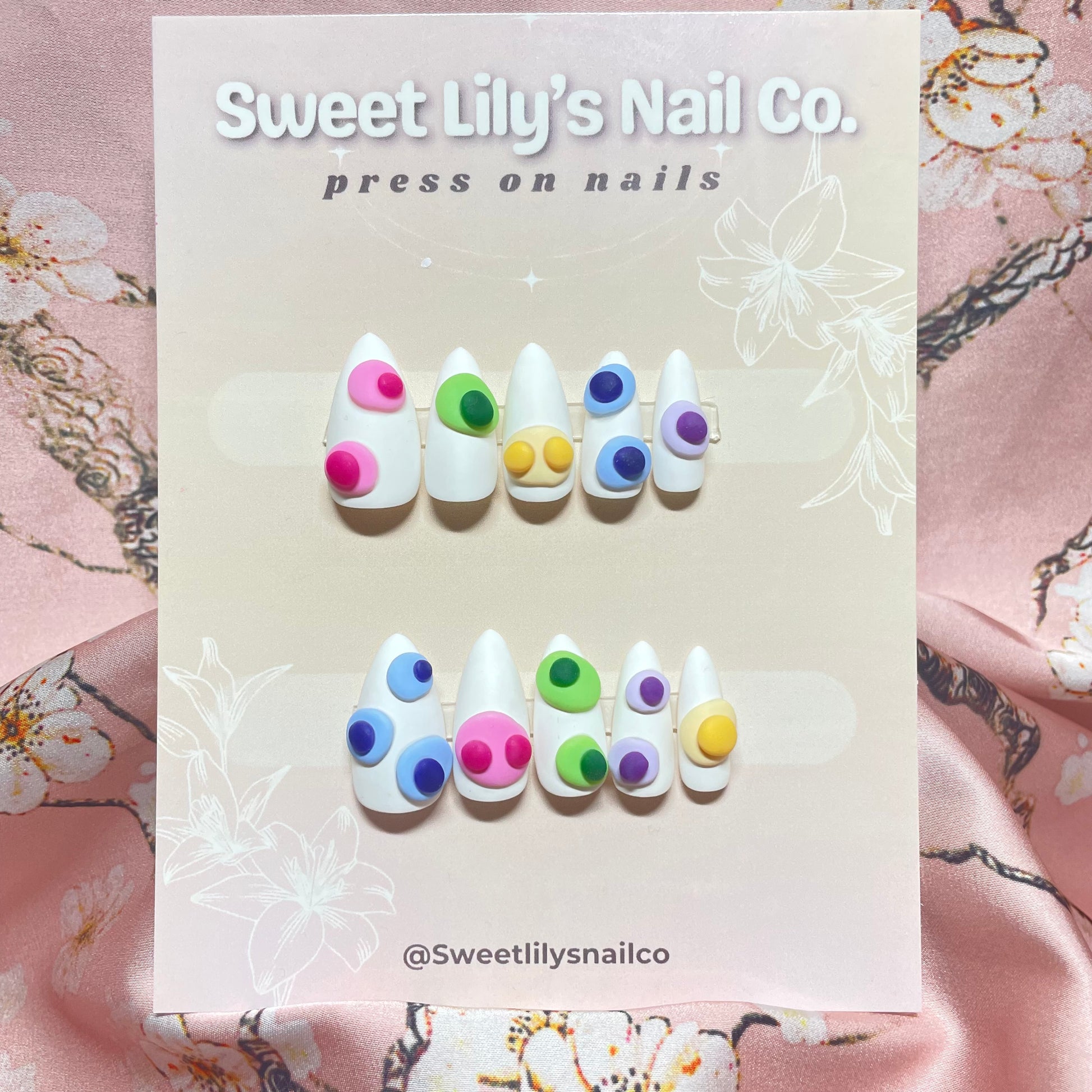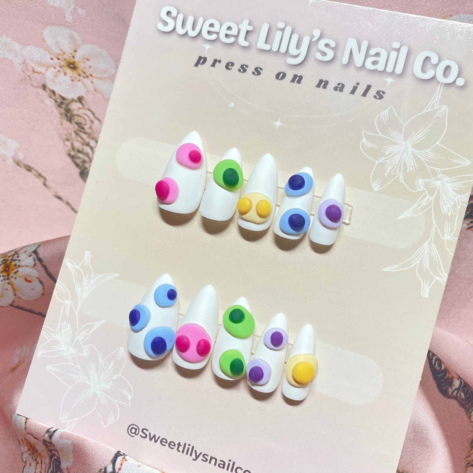 Add a playful touch to your nails with our Rainbow Sunny Side Up Egg Set. Featuring hand-crafted egg charms in a variety of vibrant hues, these nails are sure to stand out. Perfect for anyone looking to add a fun and unique element to their manicure.