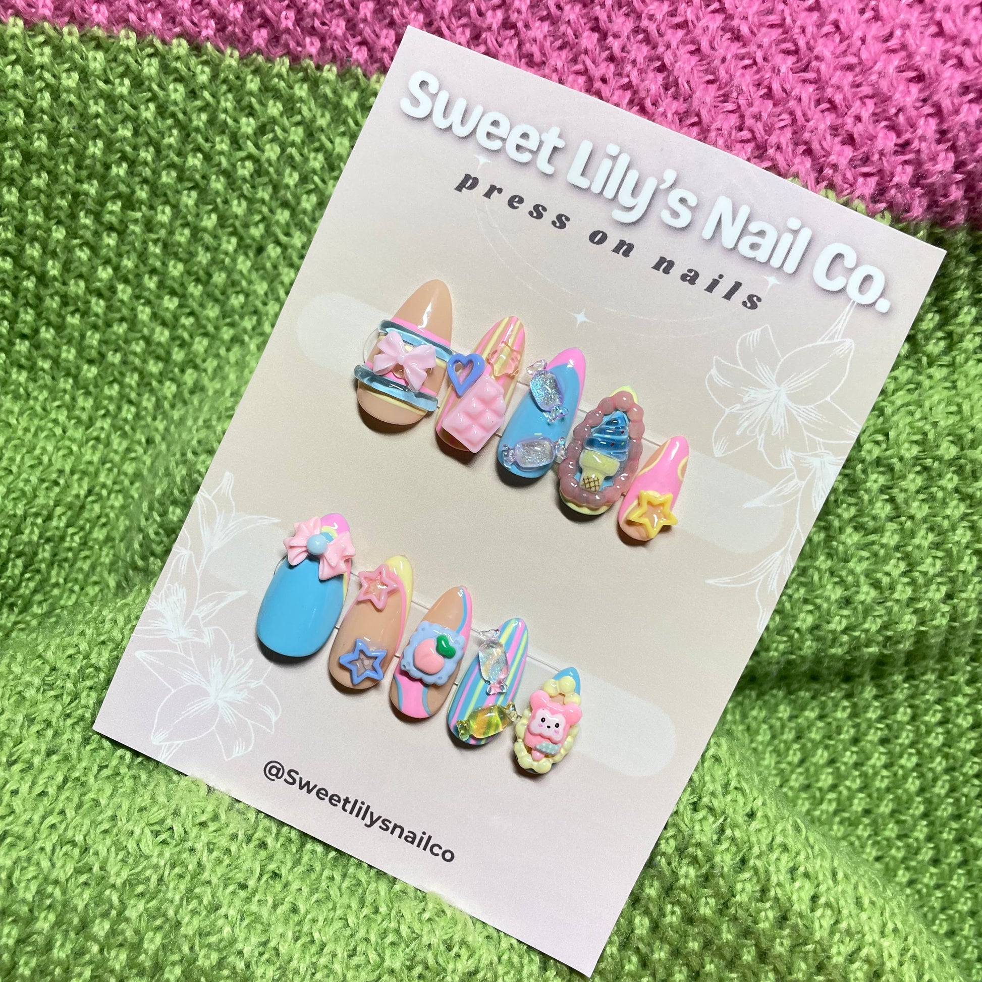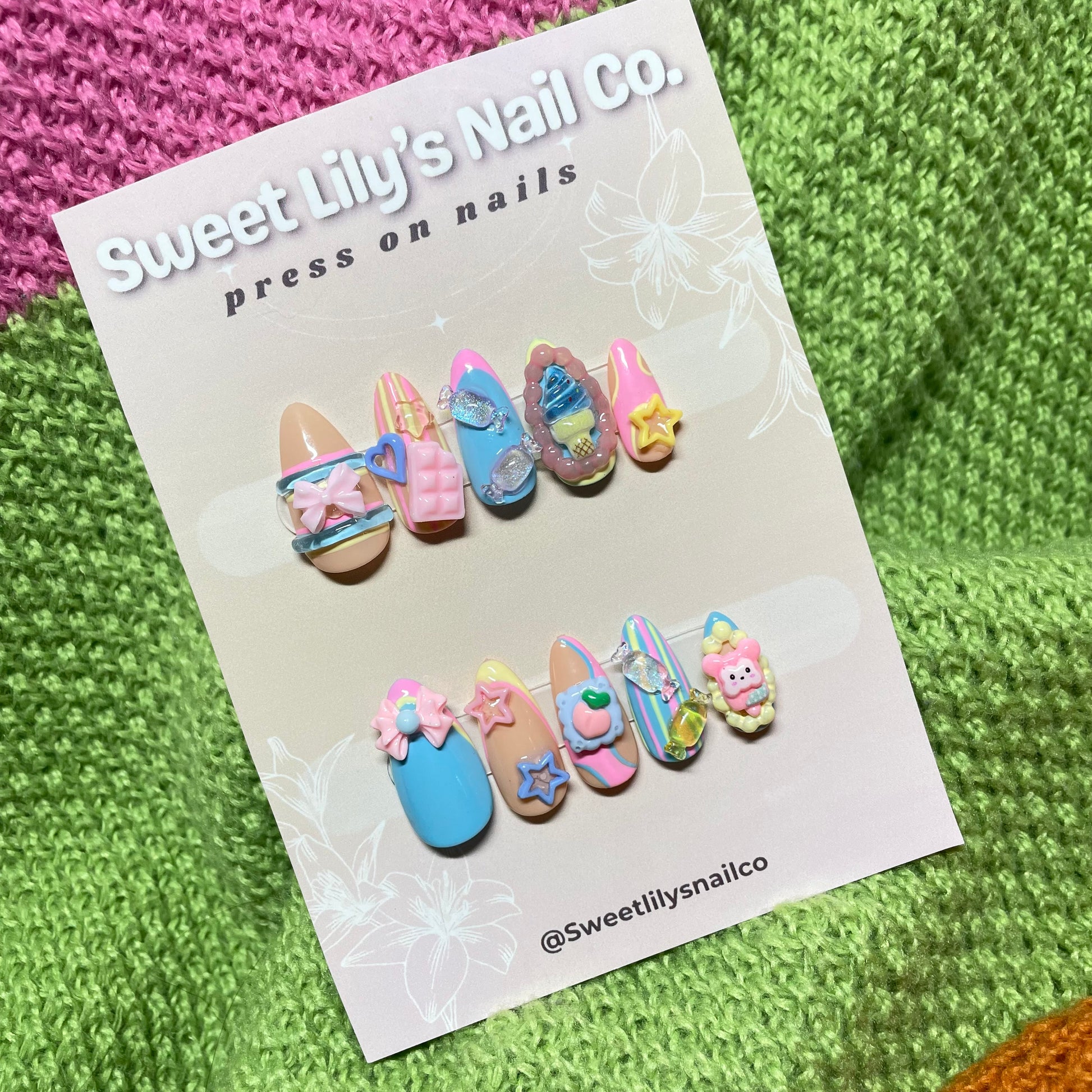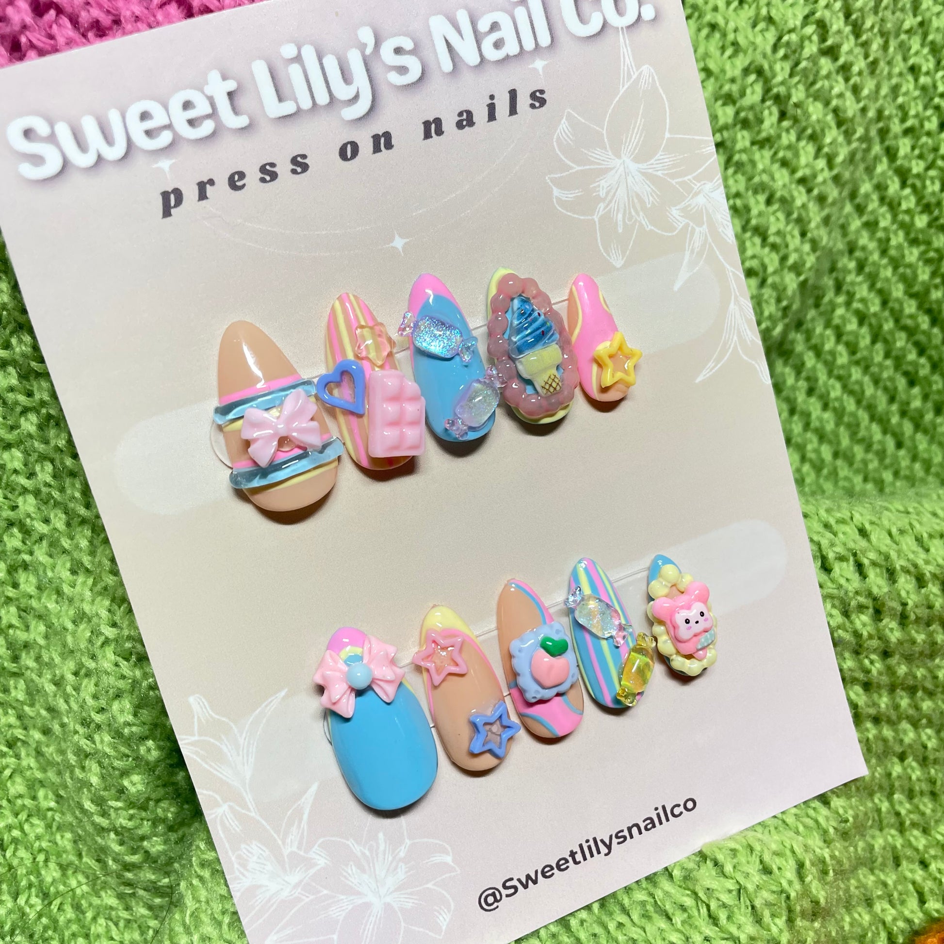 Step up your nail game with our Pastel Kawaii Candy set. This unique set is designed with bright pastel colors and adorned with delightful candy charms. Each set is completely one of a kind, inspired by the set shown above. Available in short almond style for a cute and trendy look.