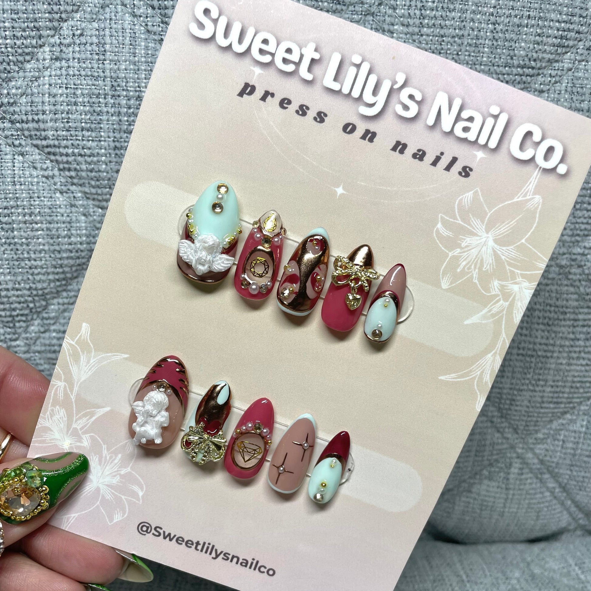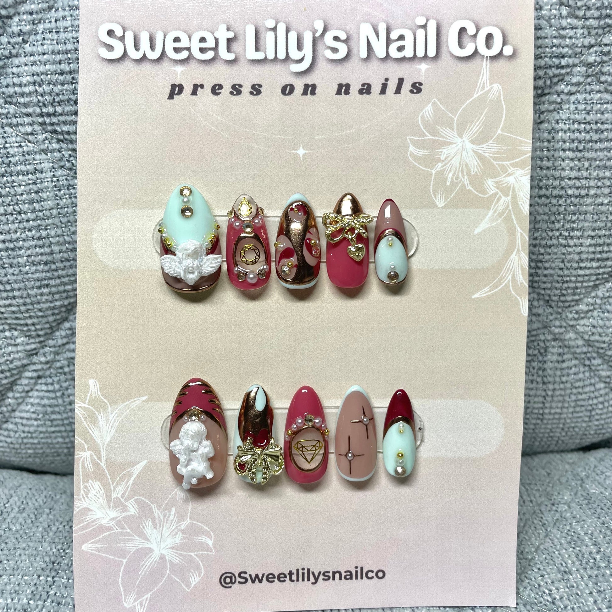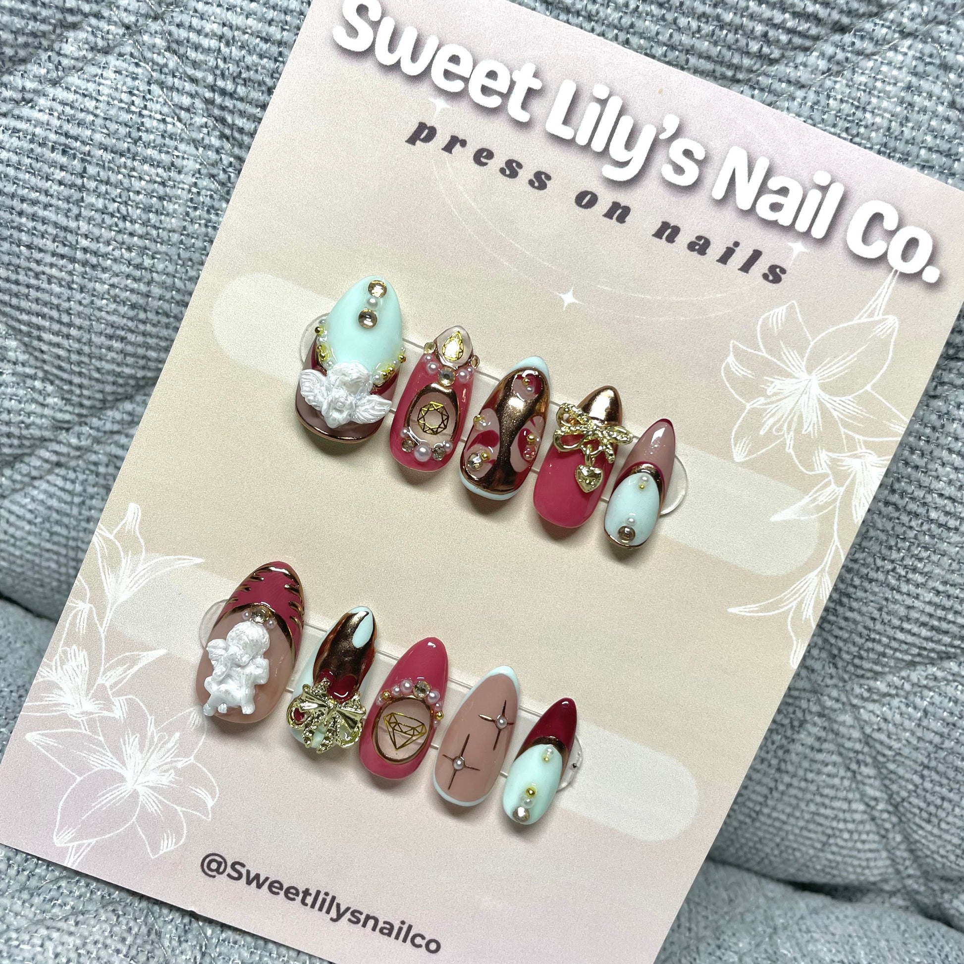 Experience the elegance of our Stargazing Angel Set, featuring a stunning combination of pink, light blue, and red colors, embellished with gold chrome accents and charming angel details. Perfect for adding a touch of sophistication to any outfit. Each hand made may vary in charms depending on inventory.